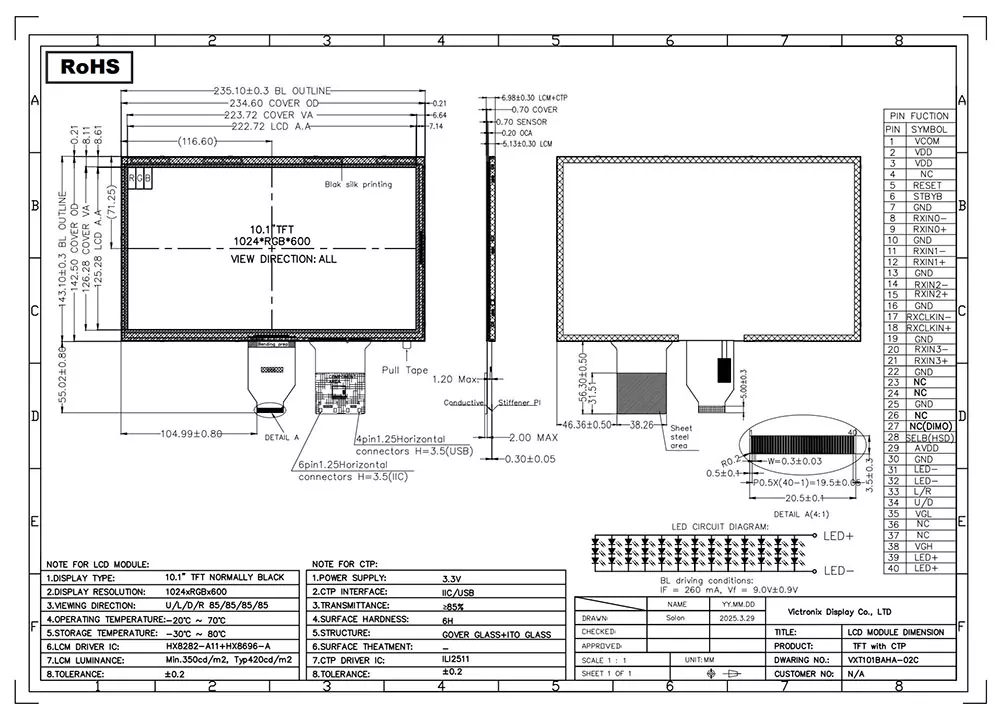 इंटेलिजेंस के युग में, टीएफटी मॉड्यूल हमें आवश्यक डेटा को नेत्रहीन रूप से प्रस्तुत करने में सक्षम बनाता है। टीएफटी मॉड्यूल की गुणवत्ता का इसके आवेदन पर महत्वपूर्ण प्रभाव पड़ता है। CTP के साथ Victronix 10.1 इंच 1024 × 600 LVDS TFT मॉड्यूल के क्या फायदे हैं? सबसे पहले, इसकी 420 सीडी/मीट की चमक, 800: 1 कंट्रास्ट अनुपात, सभी दिशाओं में 80-डिग्री देखने का कोण, और 75% एकरूपता ज्वलंत कल्पना सुनिश्चित करती है। दूसरे, यह HX8282A11+HX8696A नियंत्रक और ILI2511 CTP नियंत्रक के साथ एक मजबूत 5-पॉइंट कैपेसिटिव टच पैनल के साथ 6/8-बिट LVDS इंटरफ़ेस का समर्थन करता है। इसके अतिरिक्त, यह 30,000 से 50,000 घंटे के जीवनकाल के साथ 3 × 13-नेतृत्व वाली सफेद बैकलाइट की सुविधा देता है, जो विभिन्न औद्योगिक अनुप्रयोगों में इसकी दीर्घकालिक प्रयोज्य सुनिश्चित करता है। इसके अलावा, यह ROHS मानकों का अनुपालन करता है और सफलतापूर्वक कठोर विश्वसनीयता परीक्षणों को पारित करता है, जिसमें थर्मल शॉक, आर्द्रता और ईएसडी सुरक्षा 8kV हवा और 4kv संपर्क तक शामिल है। यह उत्पाद -20 डिग्री सेल्सियस से +70 डिग्री सेल्सियस तक के अत्यधिक तापमान में कुशलता से संचालित होता है और -30 डिग्री सेल्सियस से +80 डिग्री सेल्सियस से गंभीर भंडारण की स्थिति का सामना कर सकता है।