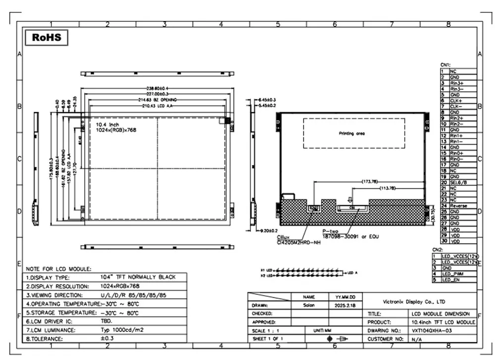 यह victronix 10.4 इंच 1024 × 768 LVDs उच्च चमक TFT मॉड्यूल एक उच्च-प्रदर्शन 10.4 इंच TFT-LCD मॉड्यूल है जो औद्योगिक वातावरण में विश्वसनीयता के लिए इंजीनियर है। 1024 × 768 रिज़ॉल्यूशन और 16.7 मिलियन रंगों के साथ एक IPS पैनल की विशेषता है, यह 85 ° (3/6/9/12 O’Clock दिशाओं) के व्यापक देखने के कोणों के साथ असाधारण दृश्य स्पष्टता प्रदान करता है। इसके अलावा, यह एक 1000 सीडी/मीटर उच्च चमक, एक 1000: 1 विपरीत अनुपात, और प्रत्यक्ष सूर्य के प्रकाश के तहत स्पष्ट देखने के लिए 80% एकरूपता प्रदान करता है। एक पेशेवर निर्माता और चीन में टीएफटी मॉड्यूल के आपूर्तिकर्ता के रूप में, यह विक्ट्रोनिक्स 10.4 इंच टीएफटी मॉड्यूल आरओएचएस पर्यावरण मानकों के साथ पूरी तरह से अनुपालन है, बेहतर अनुप्रयोग प्रदर्शन सुनिश्चित करता है। हम अपने ग्राहकों की जरूरतों को पूरा करने के लिए एक अनुकूलित सेवा प्रदान करते हैं।