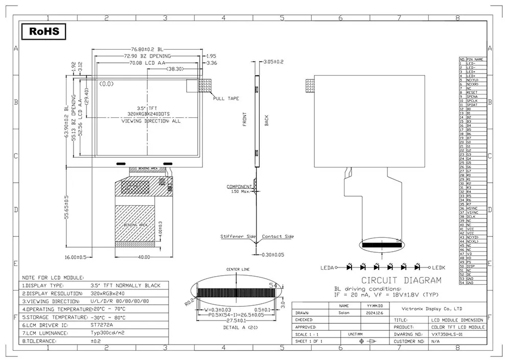 टीएफटी एलसीडी एक प्रकार का लिक्विड क्रिस्टल डिस्प्ले है जो छवि की गुणवत्ता को बढ़ाने के लिए पतली-फिल्म ट्रांजिस्टर तकनीक का उपयोग करता है, और इसके रोजमर्रा की जिंदगी में कई अनुप्रयोग हैं। चीन में एक पेशेवर टीएफटी मॉड्यूल निर्माता और आपूर्तिकर्ता के रूप में, क्या Victronix 3.5 इंच 320 × 240 QVGA IPS TFT मॉड्यूल अन्य निर्माताओं से अलग बनाता है? सबसे पहले, यह सभी दिशाओं में 300 सीडी/एम m, चौड़े 80 ° देखने वाले कोणों की एक विशिष्ट चमक और 800: 1 के विपरीत अनुपात प्रदान करता है, जो विभिन्न कोणों से उत्कृष्ट पठनीयता सुनिश्चित करता है। दूसरे, यह एक बैकलाइट यूनिट को एकीकृत करता है जो 6s सफेद एल ई डी का उपयोग 30,000 से 50,000 घंटे (50% प्रारंभिक चमक से) के विशिष्ट जीवनकाल के साथ करता है, जिससे सभी प्रकाश की स्थिति में स्पष्ट दृश्यता सुनिश्चित होती है। इसके अलावा, यह ST7272A नियंत्रक के साथ RGB 24-बिट इंटरफ़ेस का समर्थन करता है। इसके अलावा, यह कठोर पर्यावरणीय परीक्षण से गुजरता है, जिसमें थर्मल शॉक (-30 ° C ° +80 ° C चक्र), आर्द्रता भंडारण (60 ° C/90% Rh), और यांत्रिक कंपन शामिल हैं, यह सुनिश्चित करते हुए कि यह एक विस्तारित तापमान सीमा (-20 ° C से +70 ° C) में मूल रूप से संचालित हो सकता है।